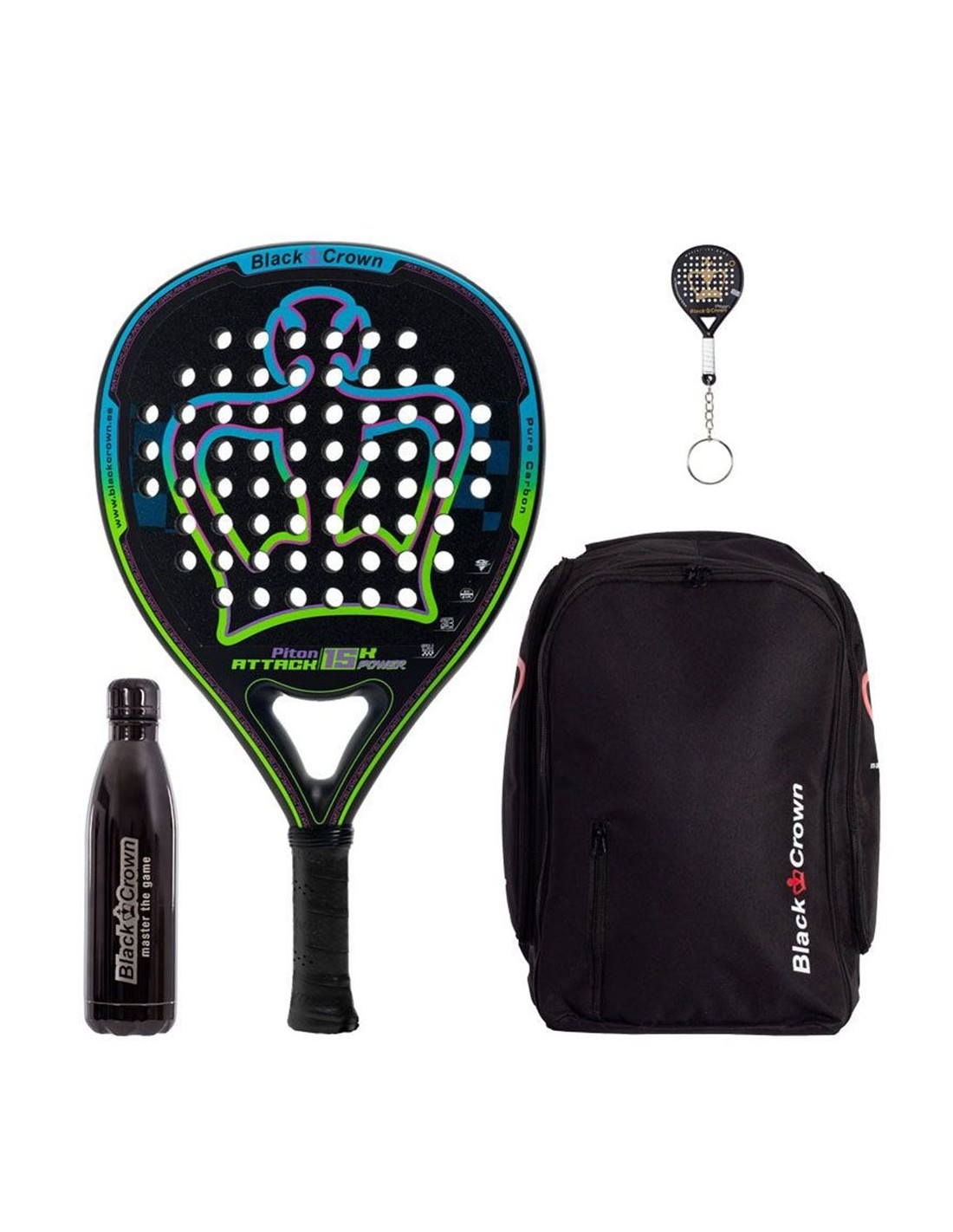 Completing the pack is a Bag Black Crown Focus with several compartments for your Racket, clothing, and accessories, all with an elegant and functional design. The thermal bottle keeps you hydrated, and the keychain adds a distinctive touch to this premium set. With the Pack Black Crown Piton Attack 15K Power, you not only get a Racket but a complete experience to compete at the highest level. Get it and take your padel game to the top!