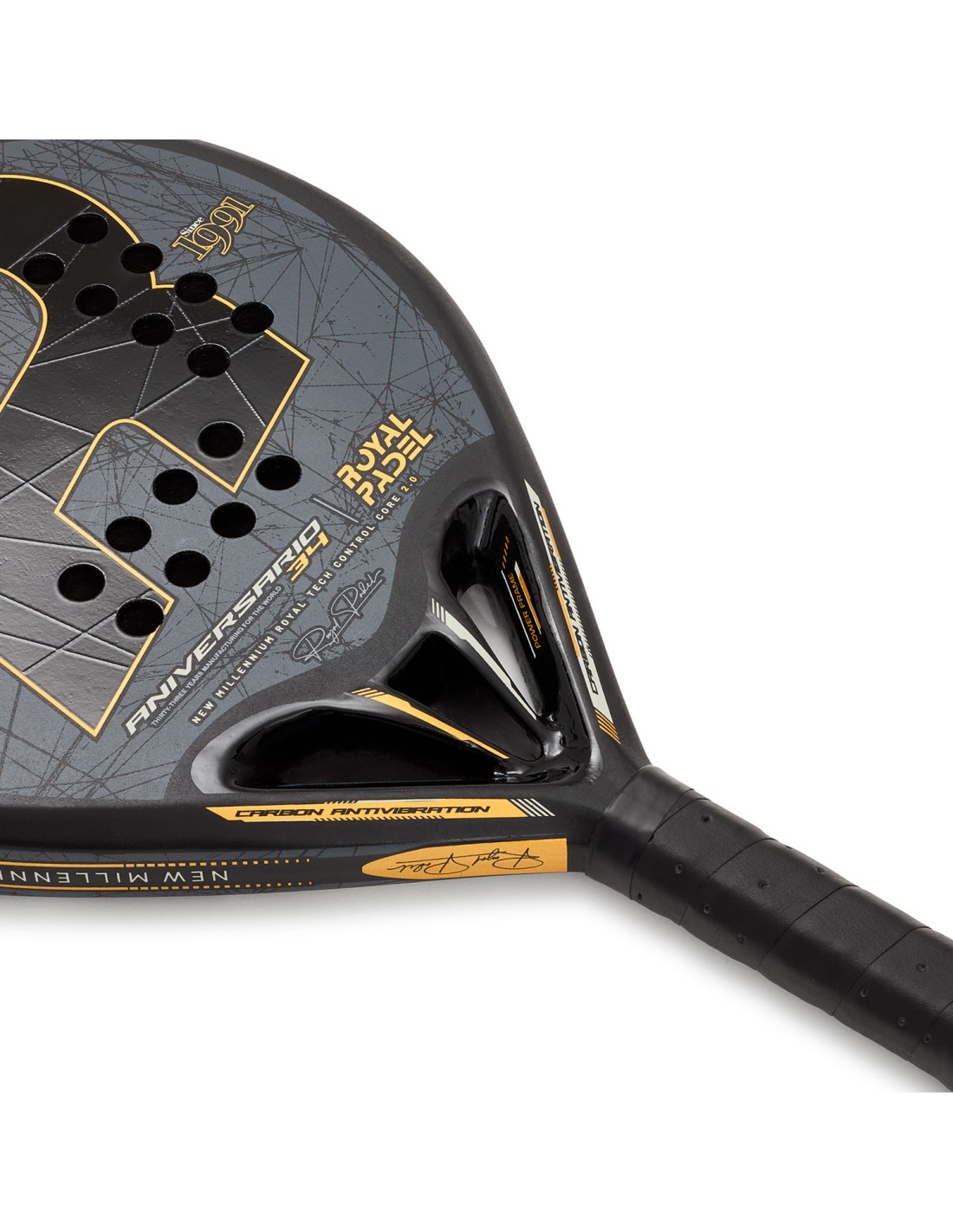Renewed Royal Padel 34th Anniversary Poly racket. Ideal for high-level players who suffer from elbow problems. Teardrop shape and soft touch.