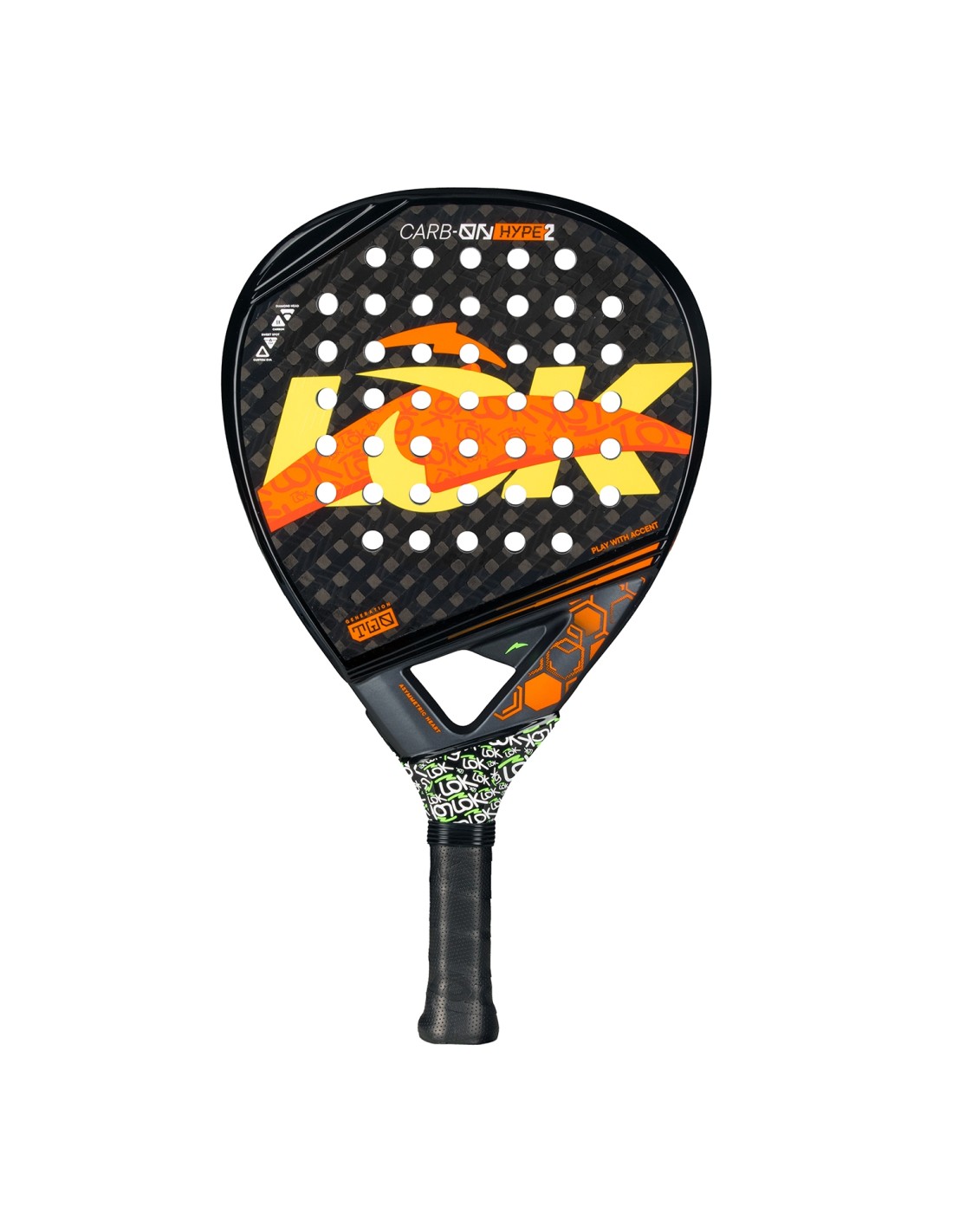 Lok presents the Carbon Hype Gen 2, a padelracket that becomes the perfect ally for advanced players who want to squeeze the most out of every shot. With its oversized diamond-shaped design and high balance, this racket offers impressive power , ideal for those looking to dominate offensive play from any corner of the court. Weighing between 360 and 375 grams, and measuring 455 mm long and 38 mm thick, it is the ultimate tool for the most demanding players.
