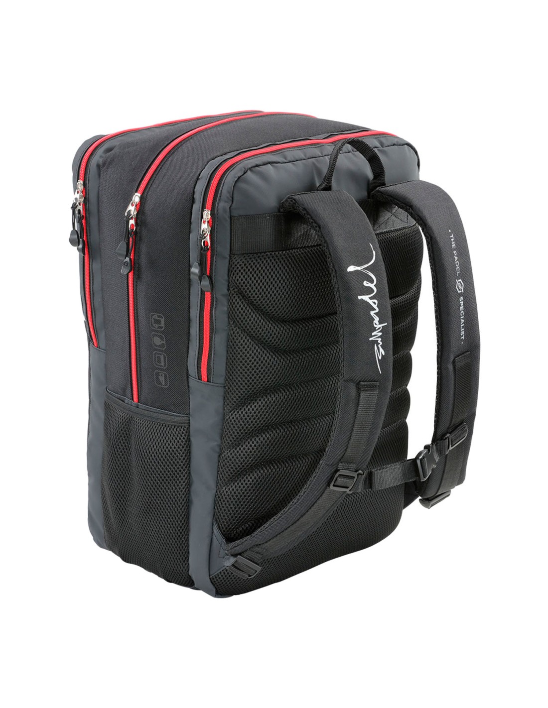 Bullpadel A nova mochila Ionic é o complemento perfeito para transportar todos os seus pertences da forma mais segura e confortável. É feita de poliéster e tecido emborrachado, o que a torna mais resistente ao uso. Tem um design moderno e elegante, em preto com pormenores em branco e vermelho. Tem um compartimento térmico acolchoado com capacidade para transportar duas pás e outro compartimento acolchoado com capacidade para transportar mais duas pás, computadores portáteis ou tablets. Tem também um compartimento principal para guardar todas as suas roupas. Além disso, existe um compartimento separado e ventilado para roupa e calçado. Existe um bolso exterior na parte da frente. Esta mochila destaca-se pelo seu conforto ao transportar os seus pertences, graças às inserções de espuma no painel traseiro, que garantem a máxima ventilação e conforto para as suas costas. Além disso, possui uma correia peitoral para um melhor ajuste ao corpo e um bolso lateral onde pode guardar o seu frasco de bolas.