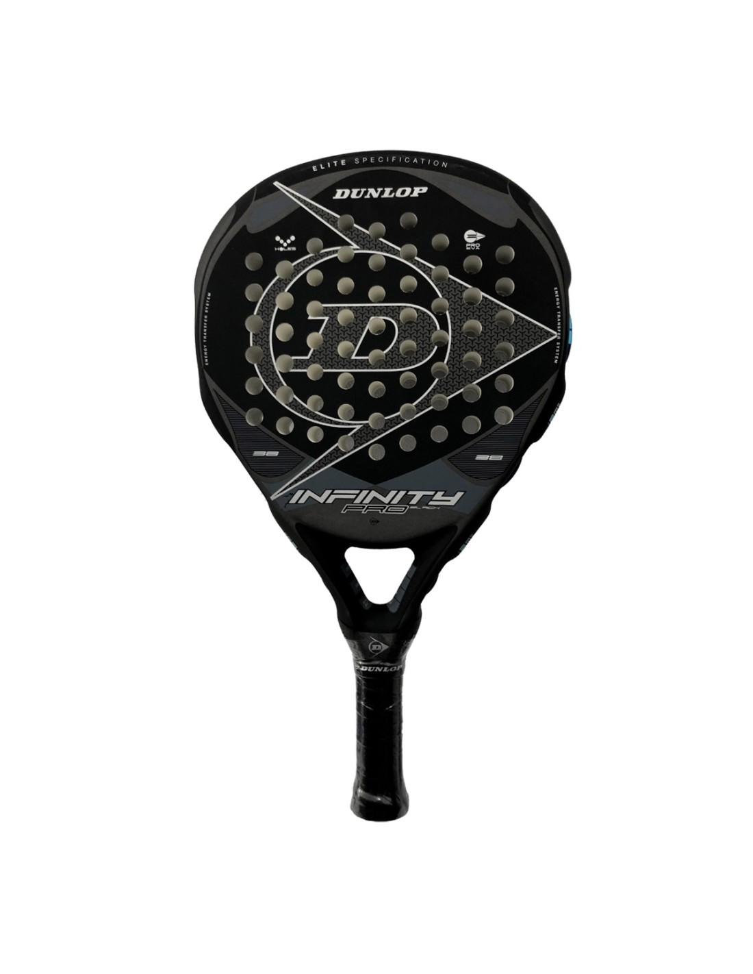 Dunlop Infinity Pro Black, raquete de padel multiuso de alta qualidade, com tecnologia Power Bar, uma tecnologia genética que permite adaptar o equilíbrio dependendo da situação do jogo. Quando em situação defensiva, o gel fica mais próximo do punho, então o equilíbrio é menor e o controle é maior, o gel se move em direção à cabeça da raquete, o equilíbrio sobe e a potência no golpe aumenta. A ponte 100% Carbono aumenta a rigidez do quadro, garante grande estabilidade no jogo e controle superior.