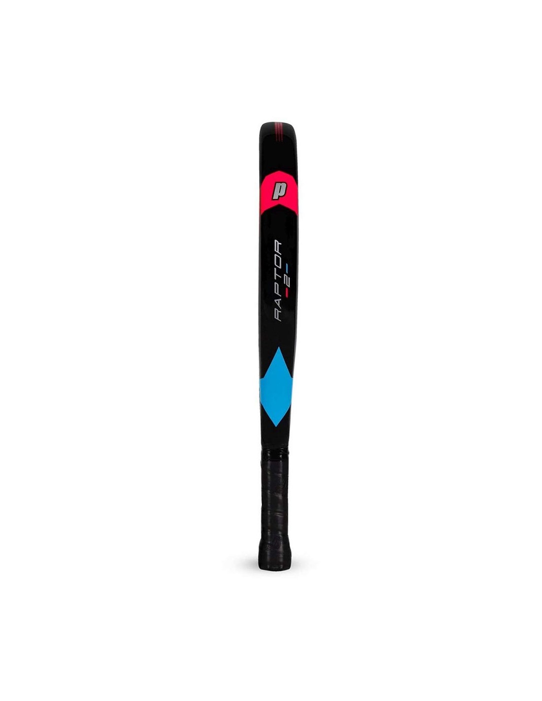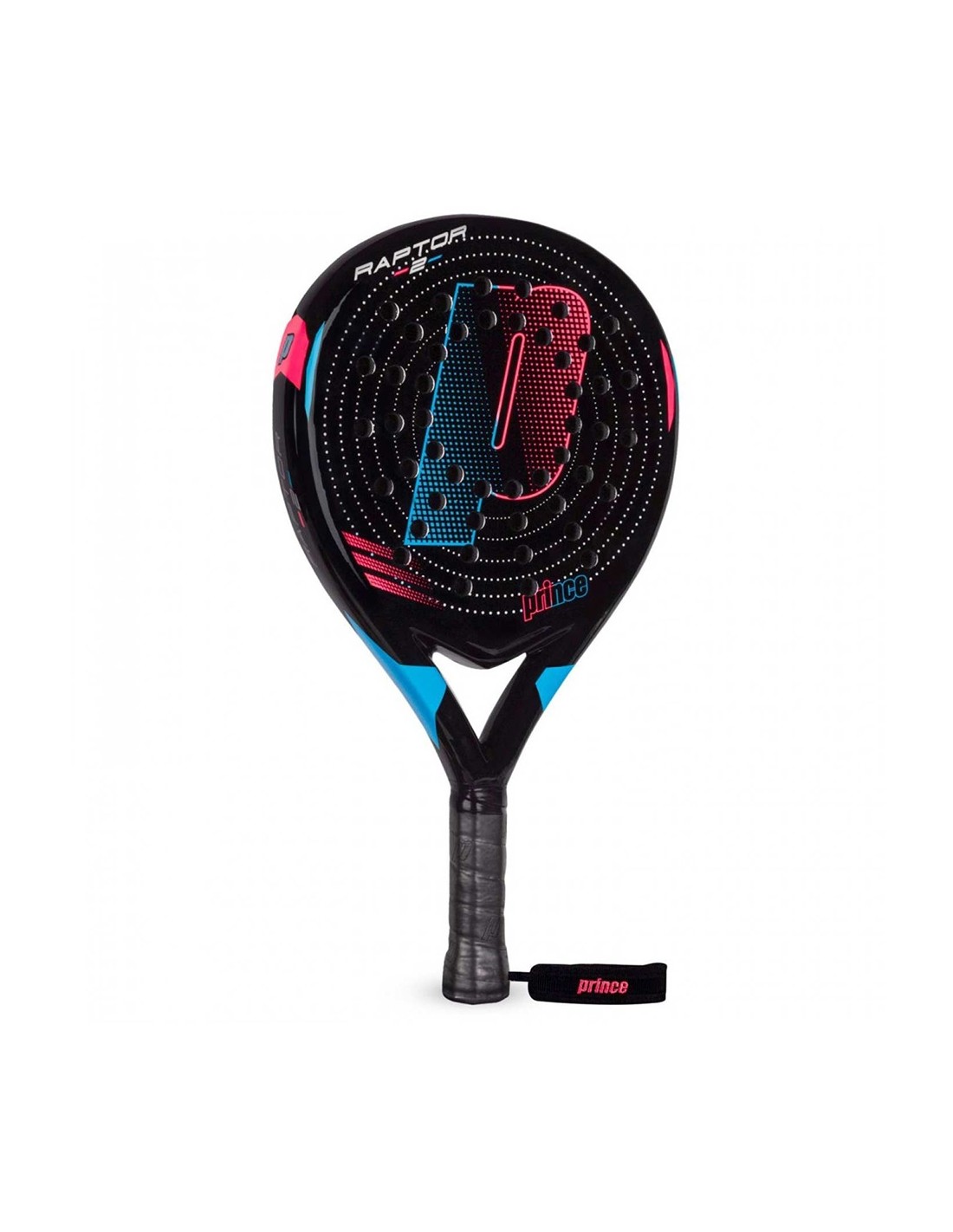 Além do seu desempenho, a Prince Raptor V2 se destaca pelo seu design vibrante e moderno. Com uma estrutura em formato de lágrima, ela ostenta um acabamento preto brilhante com detalhes em azul e fúcsia e o icônico "P" da Prince no centro, tornando esta raquete não apenas uma opção funcional, mas também visualmente marcante.